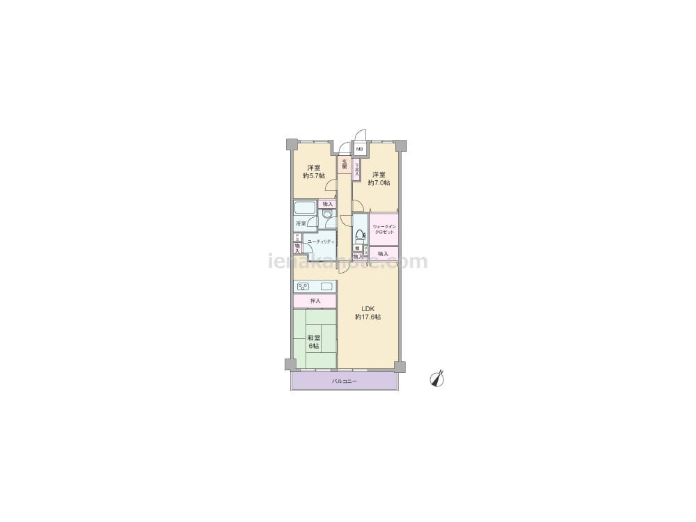 専有面積83.97平米の3LDK。LDKは約17.6帖大の広さがあり、隣接する和室の襖を開放すれば約23.6帖大の空間としても利用可能。独立タイプのキッチンは、生活感がリビングスペースに伝わりにくいのが特徴です。キッチンとユーティリティーは家事動線の良い2WAY。洗面室と洗濯機置場(ユーティリティー)が分かれて配置されているのもポイントです。収納スペースが各所にあり、洋室約7.0帖には大容量のウォークインクロゼットが設けられています。