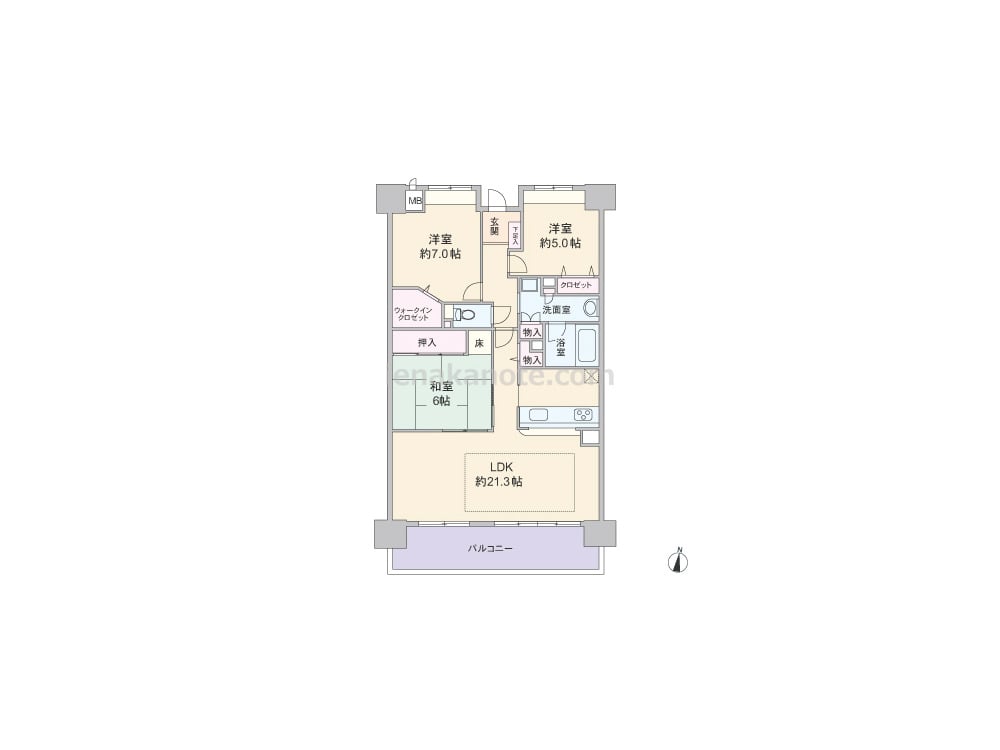 専有面積85.48平米の3LDK。LDKは約21.3帖大の広さがあり、和室6帖の襖を開放すれば空間をより広く使う事が出来ます。キッチンは家事をしながらリビングの様子が見れるカウンタータイプ。収納スペースも充実しています。バルコニーは約12.93平米あり、ガーデニングを楽しむのによさそうです。