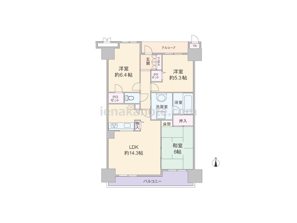 専有面積69.76平米の3LDK。LDKは約14.3帖、隣接する和室の襖を開放すれば、約20.3帖大の空間としても利用出来ます。キッチンは作業をしながら家族と会話を楽しめる対面カウンタータイプ。収納が各所にあるのもポイント。バルコニーは約11.54平米の広さがあり、ガーデニングをゆったり楽しめます。