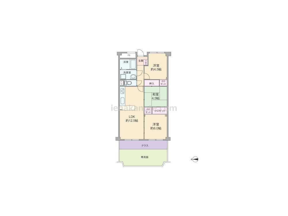 専有面積64.96平米の3LDK。専用庭付きのプラン。LDKと和室4.5帖・洋室約6.0帖が続き間になっており、個室の使用はもちろん、扉を開放すれば空間をより広く使う事が出来ます。キッチンは壁付け・オープンタイプ。キッチン横にカウンター付き。各居室に収納スペースが設けられています。専用庭約14.1平米は、家庭菜園やガーデニングを楽しむのによさそうです。