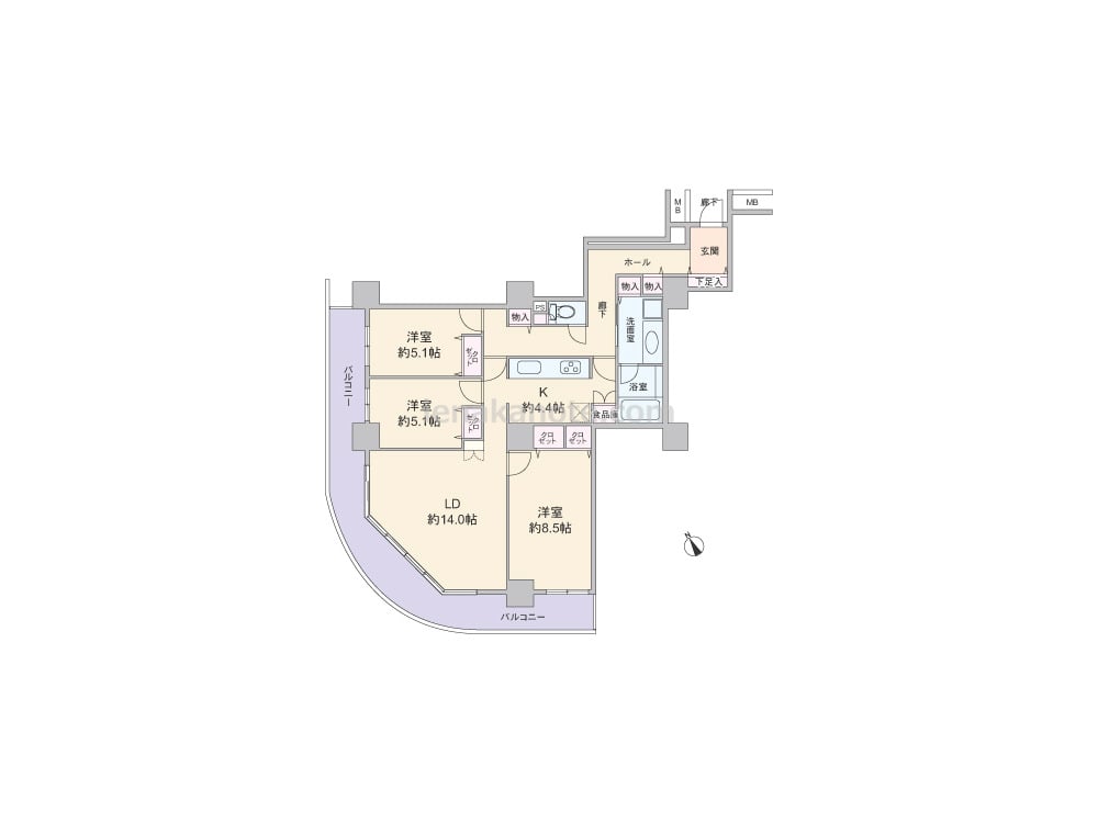 専有面積91.48平米の3LDK。住居の窓が共用廊下に面しておらず、玄関から居室が見通せない造りでプライバシーが確保されたプラン。どの部屋もバルコニーに面しており、リビングダイニングはコーナーサッシが用いられ明るく開放感があります。独立タイプのキッチンはリビングダイニングに生活感が伝わりにくいのがポイント。各居室にクロゼットがあり、その他にも物入や食品庫が設けられ収納スペースが充実しています。バルコニーは約22.05平米大と大変広く、テーブルセットを出して景色を眺めながら食事やお茶を楽しむのにぴったりです。