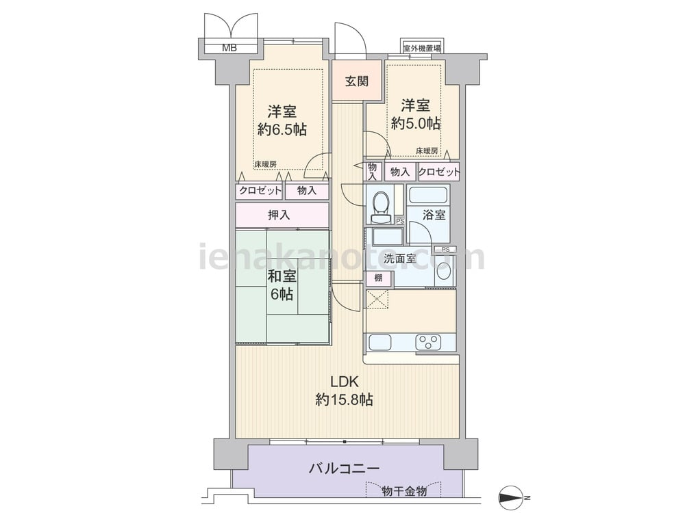 専有面積75.6平米の3LDK。リビング・ダイニングと和室6帖が続き間になっており、襖を開放すれば空間をより広く使う事が出来ます。カウンタータイプのキッチンは家事をしながら家族と会話を楽しめ、キッチンから洗面室へ行き来が可能な2WAY動線。各居室と室内廊下に収納スペースが設けられています。