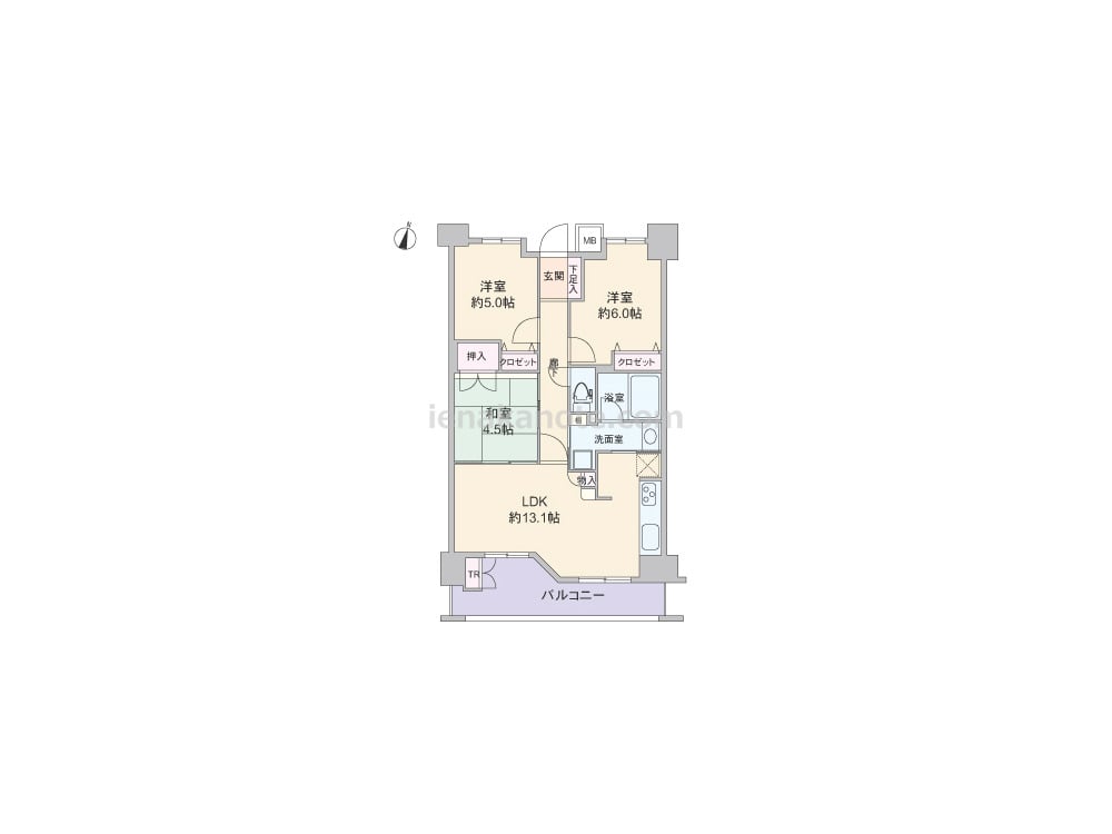 専有面積65.62平米の3LDK。LDKは約13.1帖、キッチンはI型の壁付け・オープンタイプ。キッチンから洗面室へ行き来が可能な2WAY動線です。和室4.5帖は2カ所から出入りでき、LDK側の襖を開放すれば約17.6帖大の空間に。各居室に収納スペースが設けられ、バルコニーにもトランクルームがあります。
