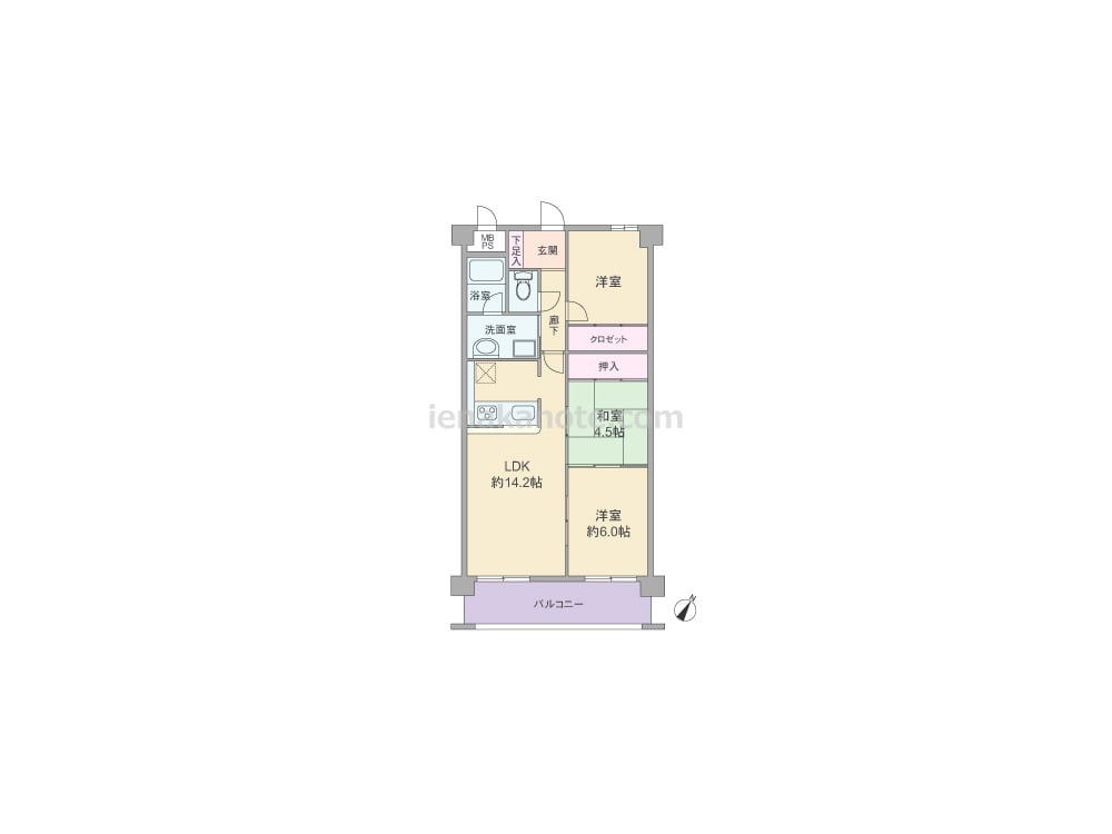 専有面積67.20平米の3LDK。LDK約14.2帖と洋室約6.0帖、和室4.5帖が続き間になったプラン。それぞれ個室に利用したり、襖を開放して空間を広く使うなど、生活シーンに合わせてフレキシブルに使用出来ます。キッチンは作業をしながら家族と会話を楽しめる対面カウンタータイプ。洋室約6.0帖には収納スペースが無いため、収納家具を置くなど少し工夫が必要です。