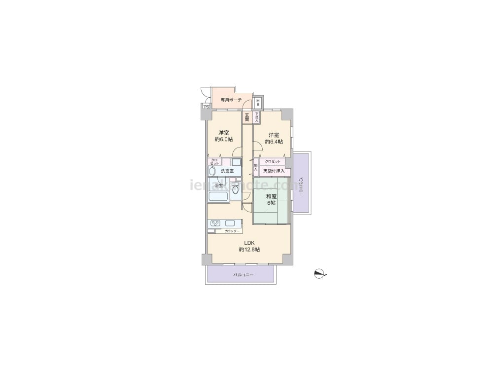 専有面積78.00平米の3LDK。玄関前に専用ポーチがあり、居室の窓が共用廊下に直接面していない、プライバシーを確保したプラン。LDKは約12.8帖、カウンタータイプのキッチンは家事をしながらリビングを見渡せる配置。和室6帖は室内廊下とLDKの2カ所から出入りでき、居室や客間に利用したり、LDK側の襖を開放して約18.8帖大の空間にするなど、生活シーンに合わせてフレキシブルに使用出来ます。各居室と室内廊下に収納スペース付き。バルコニーが2カ所あり、ガーデニングを楽しむのによさそうです。