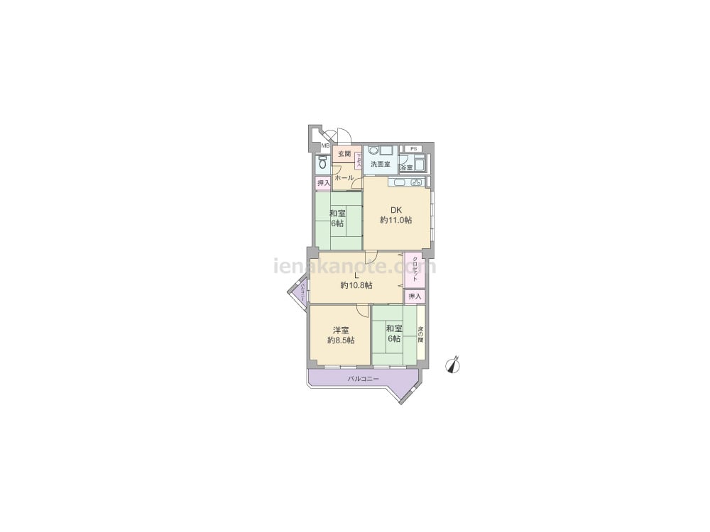 専有面積91.7平米の3LDK。居室の窓が共用廊下に面していないプライバシー重視のプラン。玄関ホールを抜けると和室があり、和室とDKの間の襖を開放すれば一つの空間として使う事が出来ます。キッチンは壁付け・オープンタイプ。洗面室へはDKを通ってアクセスします。リビングは約10.8帖大の広さとクロゼット付き。洋室約8.5帖には収納スペースが無いため、収納家具を設けるなど少し工夫が必要です。