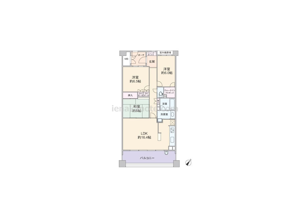 専有面積77.44平米の3LDK。玄関前に専用ポーチがある、プライバシーに配慮されたプラン。玄関に窓があるのもポイントです。LDK約16.4帖には和室が隣接しており、襖を開放すれば空間をより広々と使えます。キッチンは洗面室・バルコニーへ行き来が可能な3WAY動線。各居室と室内廊下に収納スペースが設けられています。バルコニー約13.40平米にはスロップシンクがあり、ガーデニングに利用したり、汚れ物を洗うのに便利です。