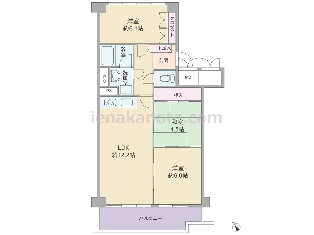 専有面積65.80平米の3LDK。センターインのプラン。玄関前に便利なトランクルーム付き。キッチンは壁付けのオープンタイプ。LDKと2部屋が続き間で、個室が欲しいとき、来客が多いときなど生活シーンに合わせて、フレキシブルに使えます。