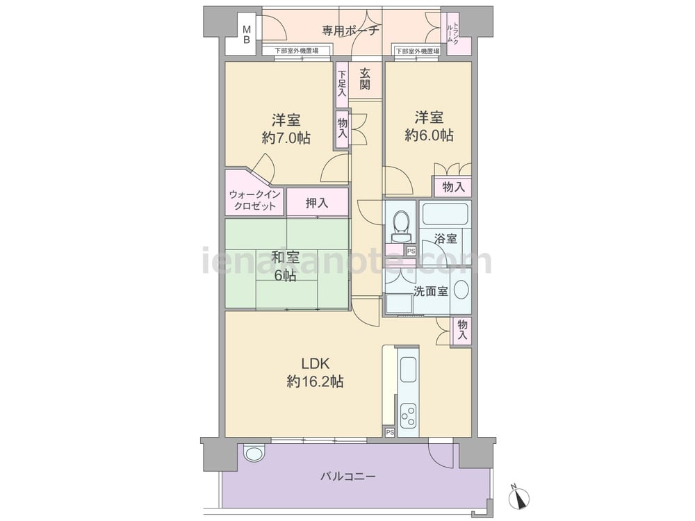 専有面積79.20平米の3LDK。玄関前にプライバシーに配慮されたポーチがあり、ポーチ内にトランクルーム付き。キッチンはバルコニーに面して配置され、洗面室とバルコニーに直接アクセスでき家事動線にすぐれています。全部屋6帖以上の広さがあり、主寝室約7帖大にはウォークインクロゼット付き。バルコニーは約14.90平米大の広さがあり、ガーデニングスペースやアウトドアリビングとしても使えます。