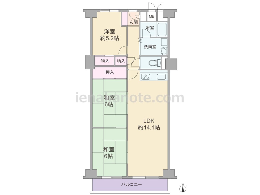 専有面積70.00平米の3LDK。LDK約14.1帖と和室2部屋は続き間になっており、襖を開放しリビングの延長としたり、それぞれ個室にするなどフレキシブルに使えるプラン。キッチンは壁付け・オープンタイプ。洋室約5.2帖はLDKから独立しており、間も廊下+収納で遮られているため、受験生の勉強部屋や書斎の利用によさそうです。