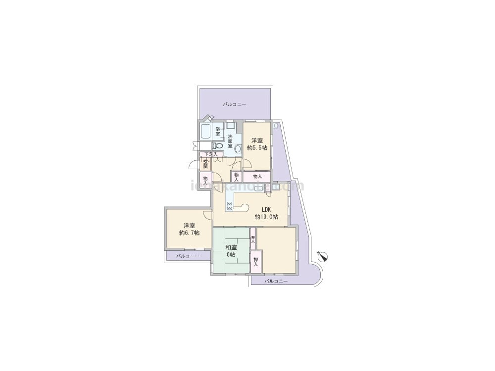 専有面積80.79平米の3LDK。センターイン、ワイドスパンのプランで、3カ所にバルコニー付き、南面に3室あります。キッチンは使いやすいL字型。リビングとダイニングキッチンはゆるやかに区切られており、リビングは開放感のある二面採光です。主寝室約6.7帖には収納がなく、家具の設置など工夫が必要。北側のバルコニーは出幅があり、ガーデニングスペースやアウトドアリビングとしても楽しめます。