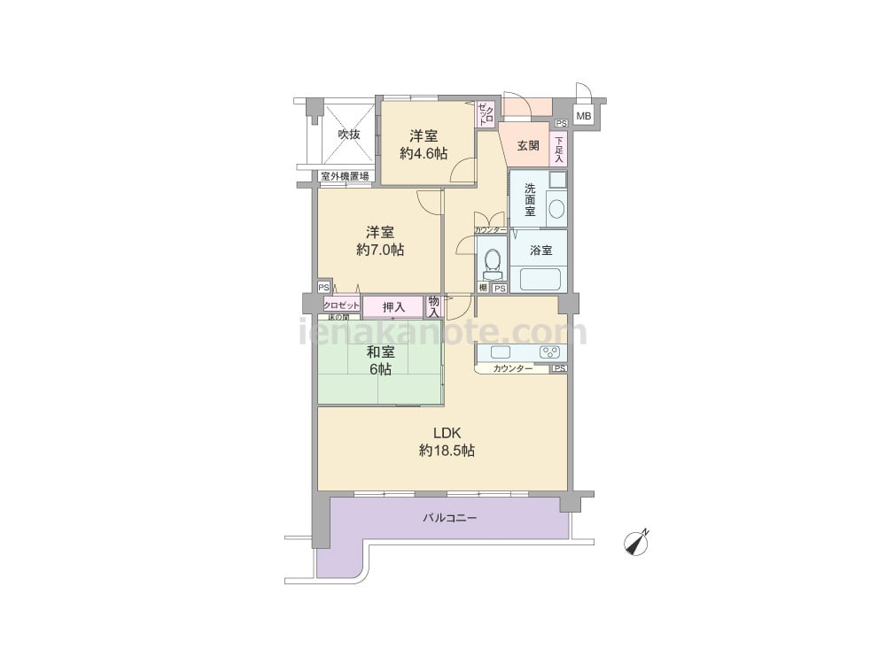 専有面積81.81平米の3LDK。LDKは広々約18.5帖大。カウンタータイプのキッチンは料理をしながら家族の様子を伺える配置です。和室は家族団欒のリビングスペースに利用したり、小さい子どもの遊び場やお昼寝コーナーにするなどフレキシブルに使える一室。洋室2部屋のクロゼットは容量が少ないため、収納家具を設けるなど少し工夫が必要。バルコニーは約12.99平米とゆとりがあり、ガーデニングを楽しむのにぴったりです。
