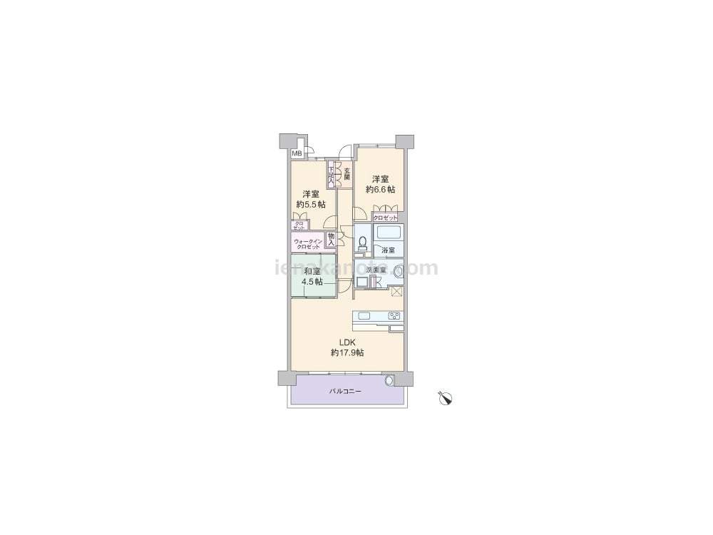 専有面積77.57平米の3LDK。玄関と共用廊下の間にアルコーブがある、プライバシーに配慮されたプラン。LDKはゆとりの約17.9帖大。キッチンは料理をしながらリビングダイニングの様子を伺え、洗面室へも出入りが可能な家事効率の良い造り。洋室約4.5帖にはウォークインクロゼットが設けられ、LDK側の扉を開放すれば約22.4帖大の空間としても使えます。洋室約5.5帖はクロゼットの容量が少ないため、収納家具を置くなどの工夫が必要です。バルコニー約11.52平米にはスロップシンクがあり、ガーデニングの利用にぴったりです。