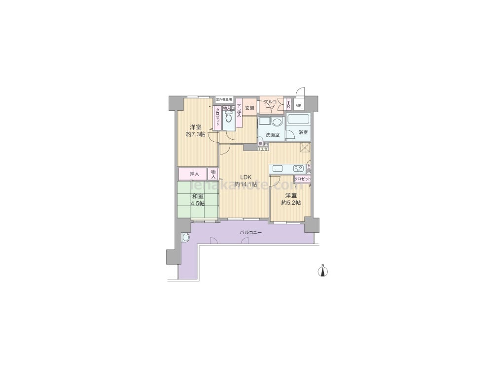 専有面積70.85平米の3LDK。玄関前にアルコーブがあり、玄関から居室が見通せない造りでプライバシーを確保。LDKは約14.1帖、キッチンは独立型のため、リビングダイニングはくつろぎの空間を保つ事が出来ます。LDKを含む3部屋が南向きで、和室4.5帖と洋室約5.2帖はLDKを通って出入りします。各居室とLDK、洗面室に収納スペースが設けられ、玄関前にもトランクルーム付き。バルコニーは約17.73平米大と広く、ガーデニングをゆったりと楽しめます。
