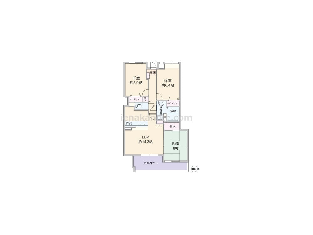 専有面積71.4平米の3LDK。LDKは約14.3帖、キッチンは料理をしながらリビングダイニングの様子を伺える対面カウンタータイプ。LDKに隣接する和室6帖は、家族が集まるリビングスペースに利用したり、居室に使用するなど、生活シーンに合わせて色々な用途に使える一室。各居室と室内廊下に収納スペースが設けられています。