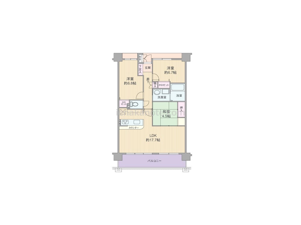 専有面積73.87平米の3LDK。LDKは約17.7帖大とゆとりがあり、キッチンは家事をしながら家族と会話を楽しめる対面カウンタータイプ。和室4.5帖は2カ所から出入りでき、客間に利用したり、LDK側の襖を開放して約22.2帖大の空間にするなどフレキシブルに使う事が出来ます。各居室と室内廊下に収納スペース付き。バルコニーは約11.88平米の広さがあり、ガーデニングを楽しむのによさそうです。