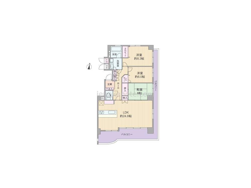 専有面積100.05平米の3LDK。専有面積100.05平米の3LDK。玄関から居室が直接見通せない、プライバシーに配慮されたプラン。LDKは広々約24.8帖大。和室の襖を開放すれば、空間をより広く使う事が出来ます。対面カウンタータイプのキッチンは料理をしながら家族とコミュニケーションが取りやすい配置。収納スペースが各所に設けられ、共用廊下に面してトランクルームもあります。バルコニーはL字型ラウンドタイプ。約28.2平米大と広く、ガーデニングを楽しむのによさそうです。