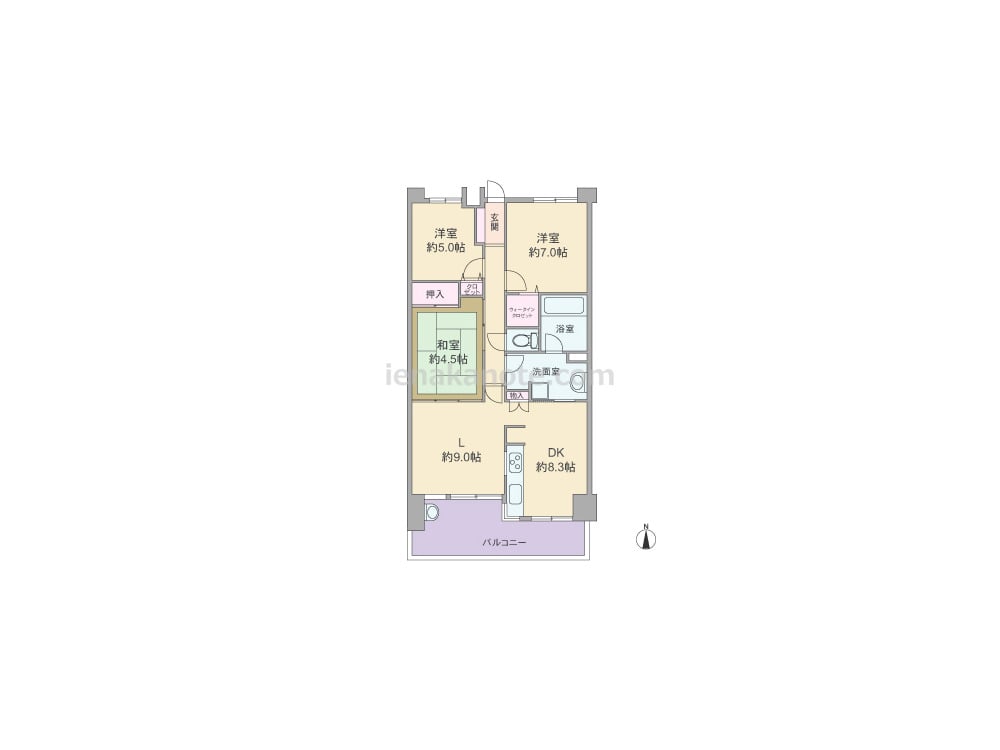専有面積78.7平米の3LDK。リビング約9.0帖に隣接する和室の襖を開放すれば、空間をより広く使う事ができ、対面仕様キッチンは家事をしながらリビングの様子を伺えます。キッチンは洗面室・バルコニーへ行き来が可能な3WAY動線なのもポイントです。洋室約5.0帖のクロゼットは容量が少ないですが、洋室約7.0帖にはウォークインクロゼットが設けられています。バルコニーにはスロップシンクがあり、ガーデニングも楽しめそうです。