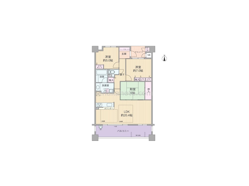 専有面積86.19平米の3LDK。玄関前にアルコーブとトランクルーム付き。玄関先から室内を直接見通せない造りで、プライバシーにも配慮されています。LDKは広々約20.4帖大。隣接する和室の襖を開放すれば、約26.4帖大の空間としても使用可能。対面カウンタータイプのキッチンは、料理中も家族と会話を楽しめる配置です。各居室と室内廊下、洗面室にも収納スペース付き。バルコニーは約16.4平米と広く、スロップシンクも付いているため、気軽にガーデニングを楽しめます。
