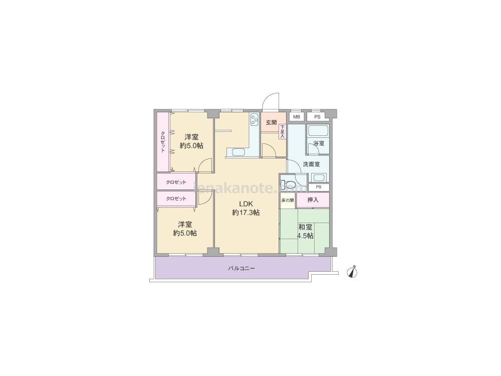 専有面積77.49平米の3LDK。LDKを含む3室が南東向き・ワイドスパンのプラン。どの部屋もLDKを通って出入りするため、自然と家族のコミュニケーションの機会が増えます。キッチンはL字型の対面タイプ。収納スペースも充実しており、バルコニーは約10.74平米あります。