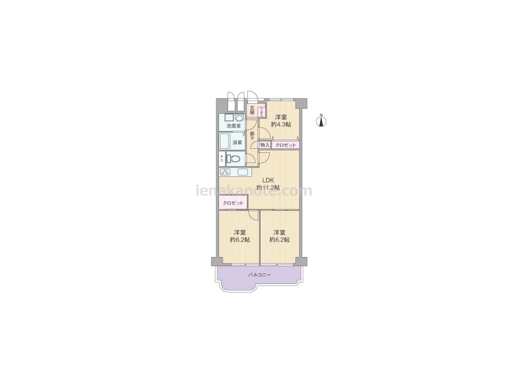 専有面積59.06平米の3LDK。LDKが部屋の中央にあるセンターリビングのプラン。東側洋室約6.2帖にはクロゼットがありませんが、扉を開放すれば約17.4帖大の空間として使う事が出来ます。その他の居室と室内廊下には収納スペース付き。洋室約4.3帖はLDKとの間を壁+収納スペースで仕切られているため、書斎や受験生の勉強部屋などの利用によさそうです。
