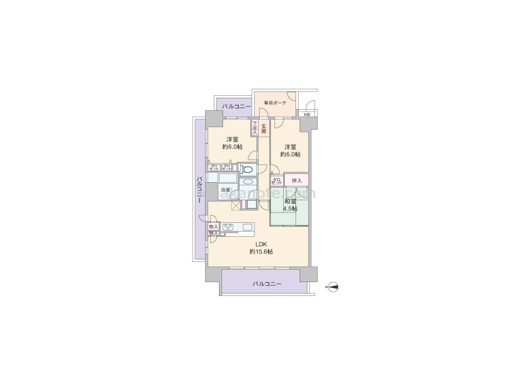 専有面積70.04平米の3LDK。玄関前に専用ポーチがあり、共用廊下に居室の窓が直接面していない、プライバシー重視のプラン。LDKは約15.6帖、対面タイプのキッチンは物入やバルコニーへの勝手口付き。和室4.5帖は室内廊下とLDKの2カ所に扉があり、客間やくつろぎのリビングスペースなど生活シーンに合わせて使い分けが出来ます。浴室の窓は換気がしやすく快適。バルコニーが全部で3カ所あり、ガーデニングなどもたっぷり楽しめます。