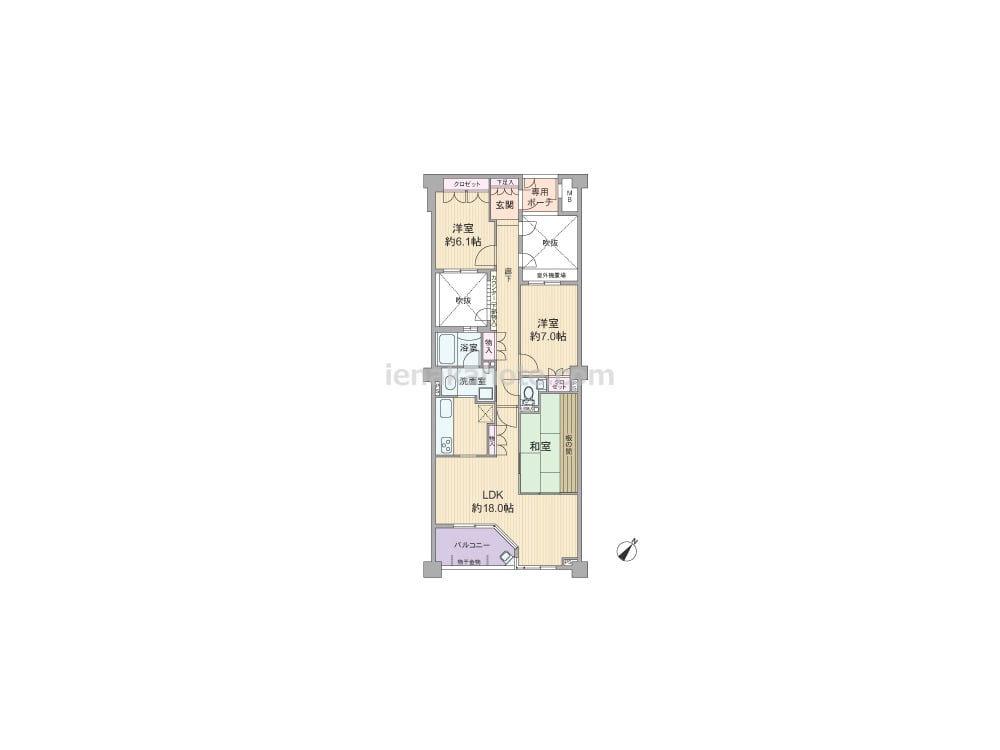 専有面積87.95平米の3LDK。居室の窓が共用廊下に面しておらず、玄関前に専用ポーチが付いたプライバシー重視のプラン。LDKは約18.0帖大とゆとりがあり、隣接する和室はくつろぎのリビングスペースとして利用するのによさそう。独立型のキッチンは洗面室へも出入りが可能な2WAY動線。浴室にも窓があります。収納スペースが各所にあり、トイレには手洗いカウンター付き。バルコニーにスロップシンクがあり、洗い物やガーデニングでの利用に便利です。