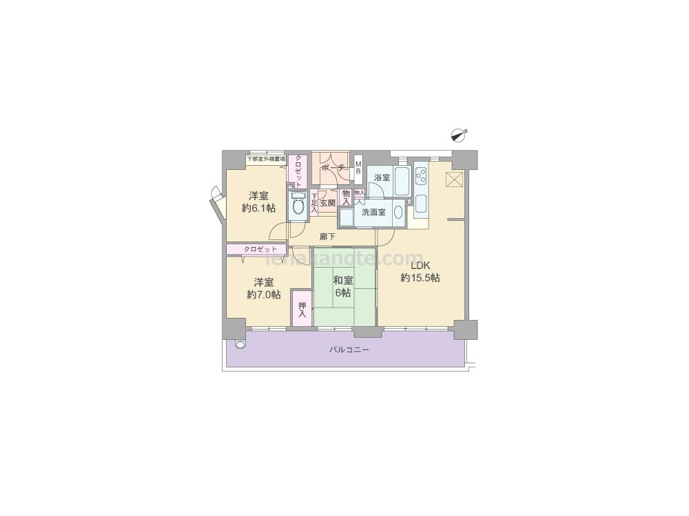 専有面積76.67平米の3LDK。玄関前にはプライバシーに配慮された専用ポーチがあります。キッチンは奥まって配置されているため、リビング・ダイニングはくつろぎの空間を演出可能。和室は室内廊下とLDKの2カ所から出入りでき、個室や客間、LDK側の襖を開放すれば約21.5帖大の空間にする事も出来ます。キッチン横と浴室に窓があるのもポイント。収納スペースも各所に設けられています。スロップシンク付きのバルコニーは約19.57平米あり、ガーデニングを楽しんだり、テーブルセットを置いてカフェテラスにしてもよさそうです。
