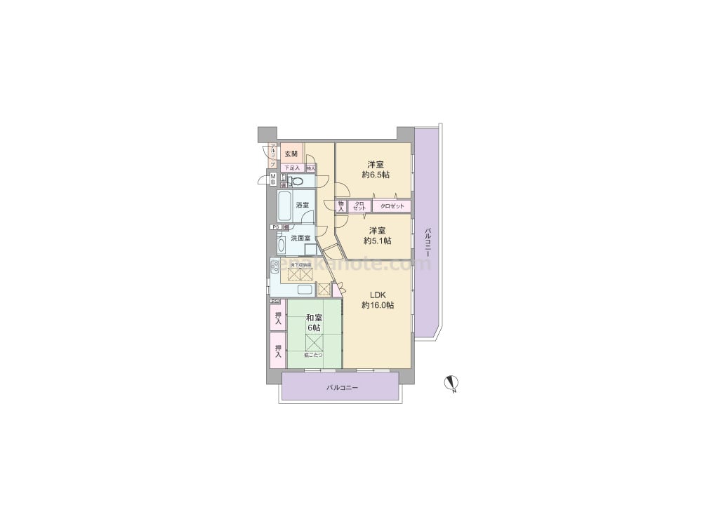 専有面積77.73平米の3LDK。居室の窓が共用廊下に面しておらず、玄関先から室内を見通せない、プライバシー性の高いプラン。二面採光のLDKに隣接する和室6帖には堀ごたつがあり、襖を開放すればLDKを広々と使う事も出来ます。独立型のキッチンは洗面室へアクセスでき、換気に配慮された窓があるのもポイント。各所に収納スペース付き。バルコニーが2カ所あり、ガーデニングなどもたっぷり楽しめます。