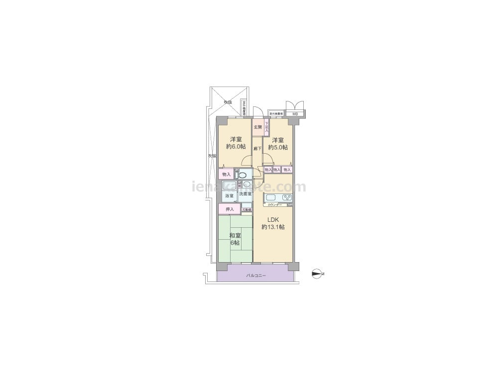 専有面積66.00平米の3LDK。LDKは約13.1帖、キッチンはリビング・ダイニングを見渡せる対面カウンタータイプの仕様です。和室6帖は個室にしたり、襖を開放してLDK約19.1帖にするなど多目的に使える一室。各居室と室内廊下に収納スペースがあり、洗面室にも稼働棚が設けられています。