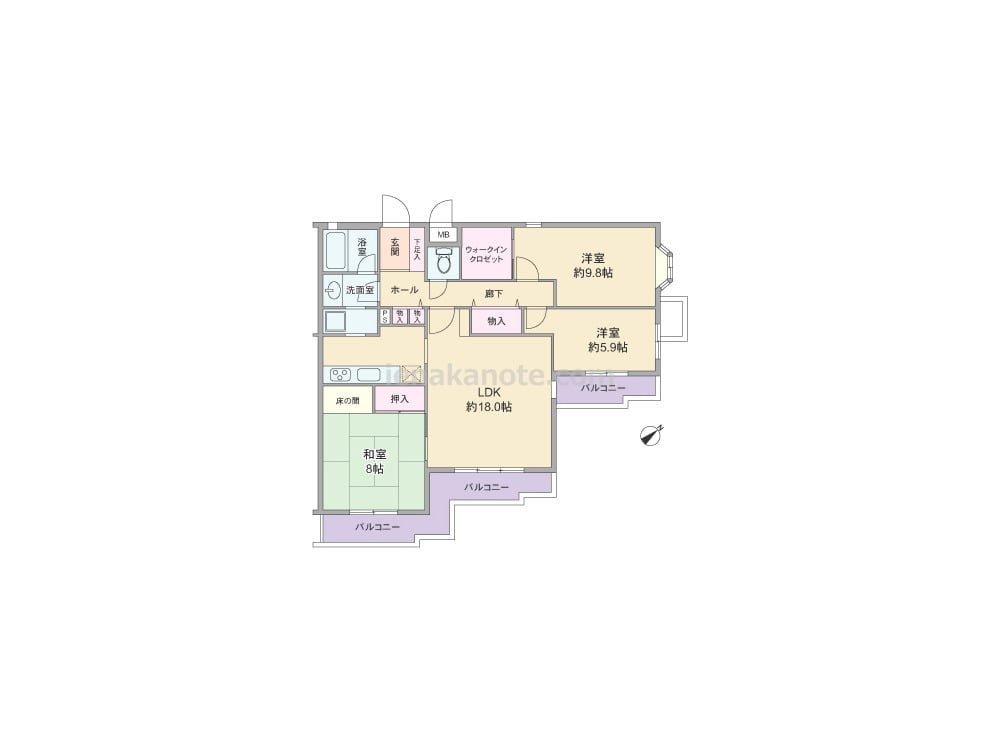 専有面積94.34平米の3LDK。玄関先から室内が見通せない造りでプライバシーを確保。LDKは約18.0帖、生活感の出やすいキッチンは独立型のため、リビング・ダイニングはくつろぎの空間を保つことが出来ます。キッチン背面には洗濯機置場もあり、家事効率の良いプラン。浴室の窓は湿気がこもりにくく快適。収納スペースが各所にあり、主寝室約9.8帖にはウォークインクロゼットが、和室8帖には床の間が付いています。バルコニーは約17.92平米あり、ガーデニングを楽しんだり、テーブルセットを置いてカフェテラスにしてもよさそうです。