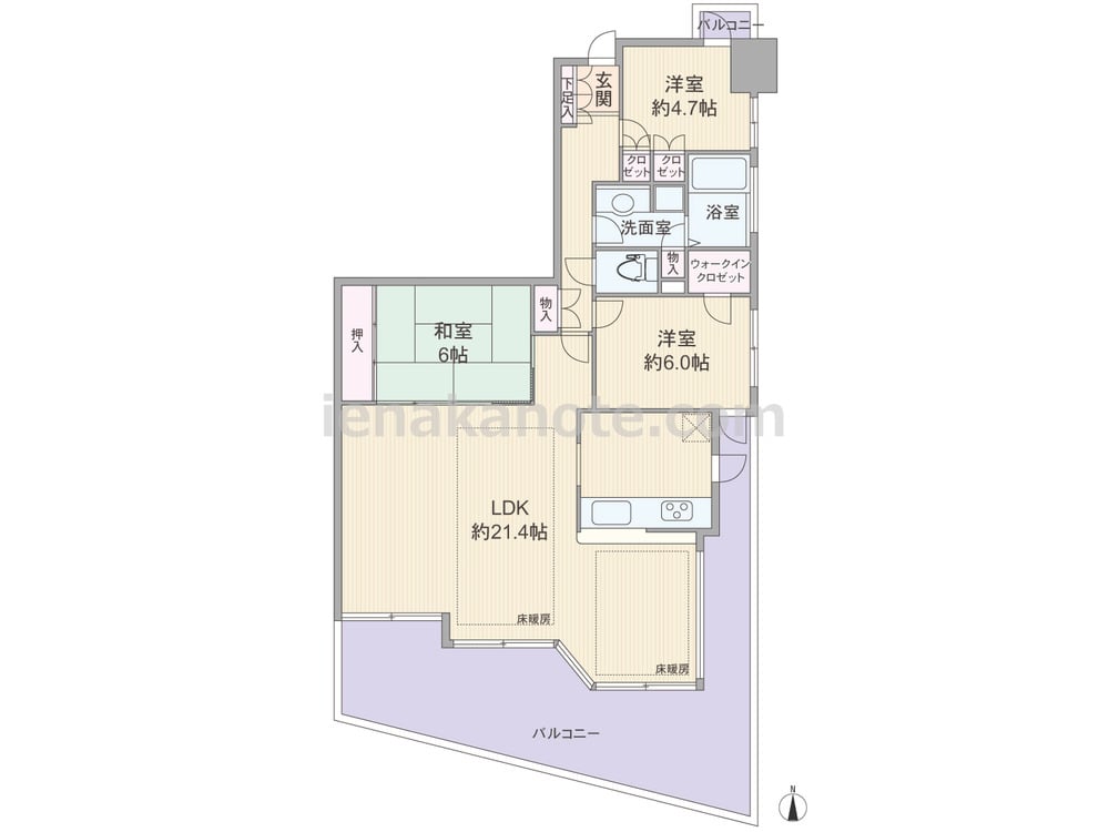 専有面積84.17平米の3LDK。ワイドスパンのプラン。リビング・ダイニングは約18.0帖大と広く、和室の襖を開放すれば約24帖大の空間にする事も出来ます。対面カウンタータイプのキッチン横にはバルコニーへの勝手口付き。収納スペースが各所にあり、洋室約6.0帖にはウォークインクロゼットが設けられています。浴室にも窓があり、換気がしやすく快適です。南側バルコニーはスペースにゆとりがあるため、テーブルセットを置いて食事やティータイムを過ごしたり、ガーデニングもたっぷり楽しめます。