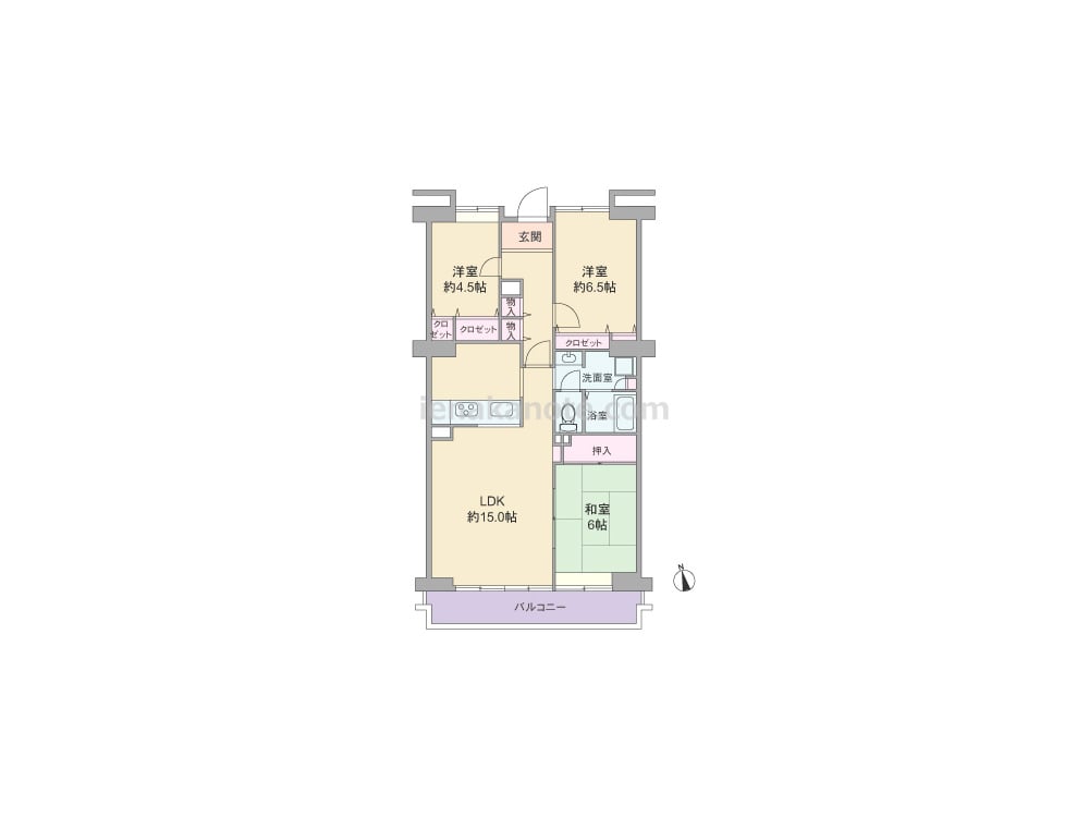 専有面積80.08平米の3LDK。LDKは約15.0帖、対面式のキッチンは作業中も家族と会話を楽しめる配置です。LDKに隣接する和室6帖は襖を開放してLDK約21.0帖大にしたり、採光・通風が確保できるため個室にも使いやすい一室です。各居室と室内廊下に収納スペース付き。LDKにも棚(下部物入)が設けられています。