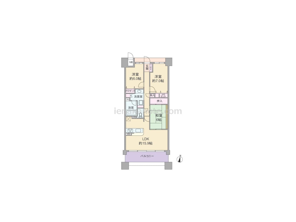 専有面積80.35平米の3LDK。全室6帖以上のゆとりがあるプラン。LDK約15.9帖には和室6帖が隣接しており、和室は室内廊下からも出入りが可能。キッチンはリビング・ダイニングを見渡せる対面カウンタータイプの仕様です。各居室と室内廊下、洗面室に収納スペース付き。バルコニーは約13.5平米の広さがあります。