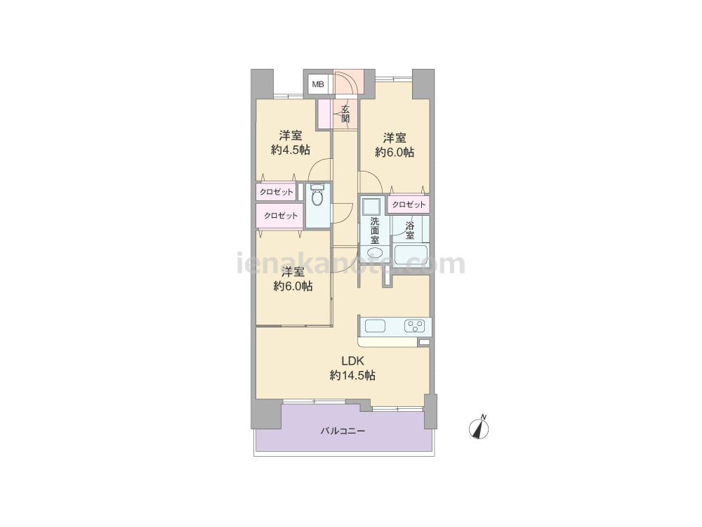 専有面積63.48平米の3LDK。横長リビングのプランで、LDKは2ヶ所に窓がある開放感のあるスペース。LDKと和室をつなげて、約20.5帖の一つの空間としても使用可能。各個室にクロゼット付き。バルコニーは11.25平米の広さがあり、ガーデニングもたっぷり楽しむ事ができます。