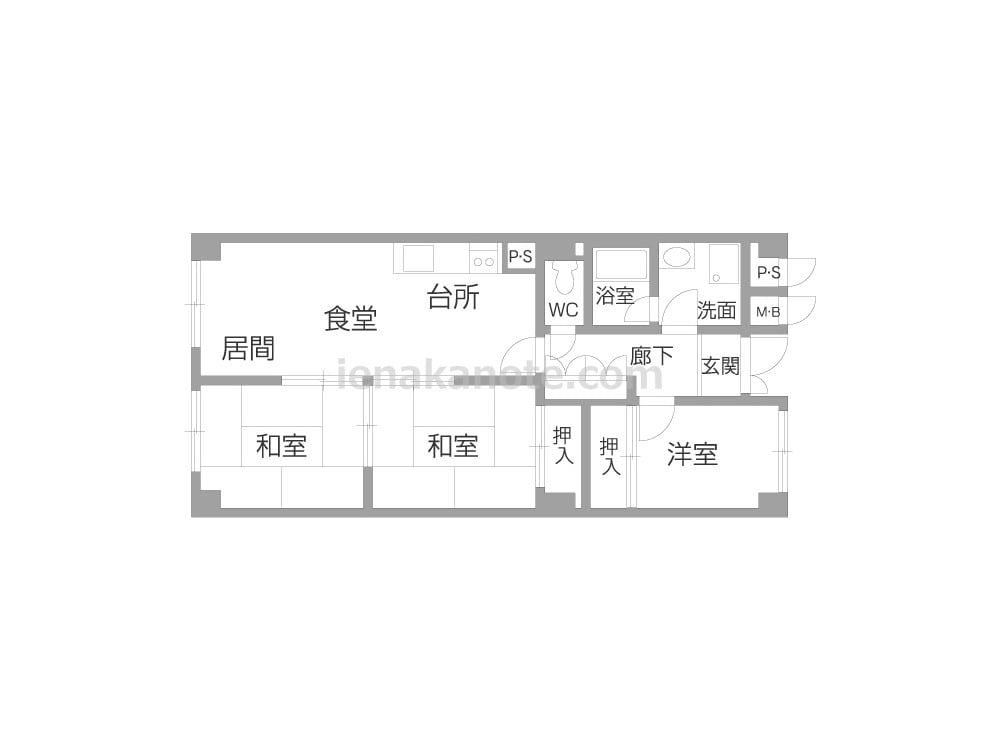 3LDKのプラン。玄関は親子扉の仕様。キッチンは作業に集中しやすい壁付けタイプ。LDKと和室が続き間になっており、それぞれ個室に利用したり、引き戸を開放して空間を広げて使うなど、生活シーンに合わせて自由に間取りを変えて使う事が出来ます。居間側の和室には押入がないため、場合により家具の設置が必要です。その他の個室と廊下に収納スペースが設けられています。