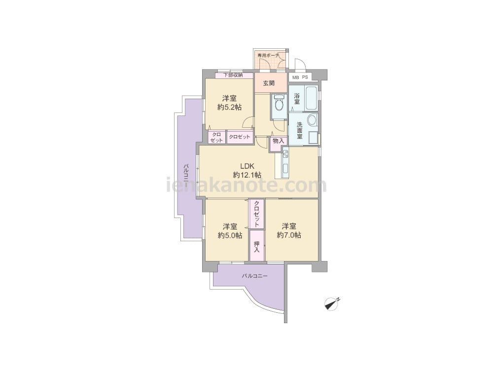専有面積67.75平米の3LDK。玄関前にはプライバシーに配慮された専用ポーチがあります。センターリビングのプランで、キッチンは作業中も家族とコミュニケーションがとりやすい対面式。また、洗面室にもアクセス可能な家事効率の良い造りです。キッチン背面、浴室に窓付き。各居室と洗面室前に収納が設けられています。バルコニーが2カ所あり、物干しスペースに困らないのはもちろん、ガーデニングを楽しむのにぴったりです。