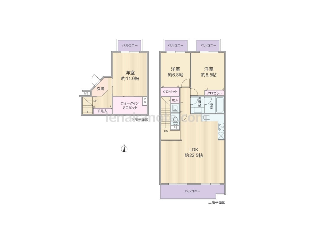 専有面積117.32平米の3LDK、メゾネットタイプ。どの部屋も6帖以上のゆとりがあります。LDKは約22.5帖大と広く、キッチンはL字型の壁付けタイプ。洗面室と洗濯機置場が分かれているため、洗面室をすっきり使えます。主寝室約11.0帖には大容量のウォークインクロゼット付き。全室がバルコニーに面しています。