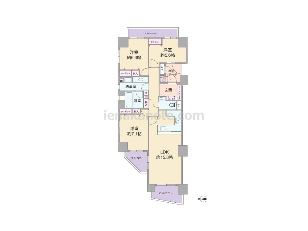 専有面積81.74平米の3LDK。共用廊下に直接面する窓が無く、玄関前に専用ポーチが付いたプライバシー重視のプラン。玄関先から室内を見通せないのもポイントです。LDKは約15.8帖、キッチンはコの字型・カウンタータイプ。収納が各所に設けられ、専用ポーチ内にもトランクルーム付き。トイレ内に手洗いカウンターがあり、洗面室・浴室の窓は換気がしやすく快適です。バルコニーは全部で3カ所あります。