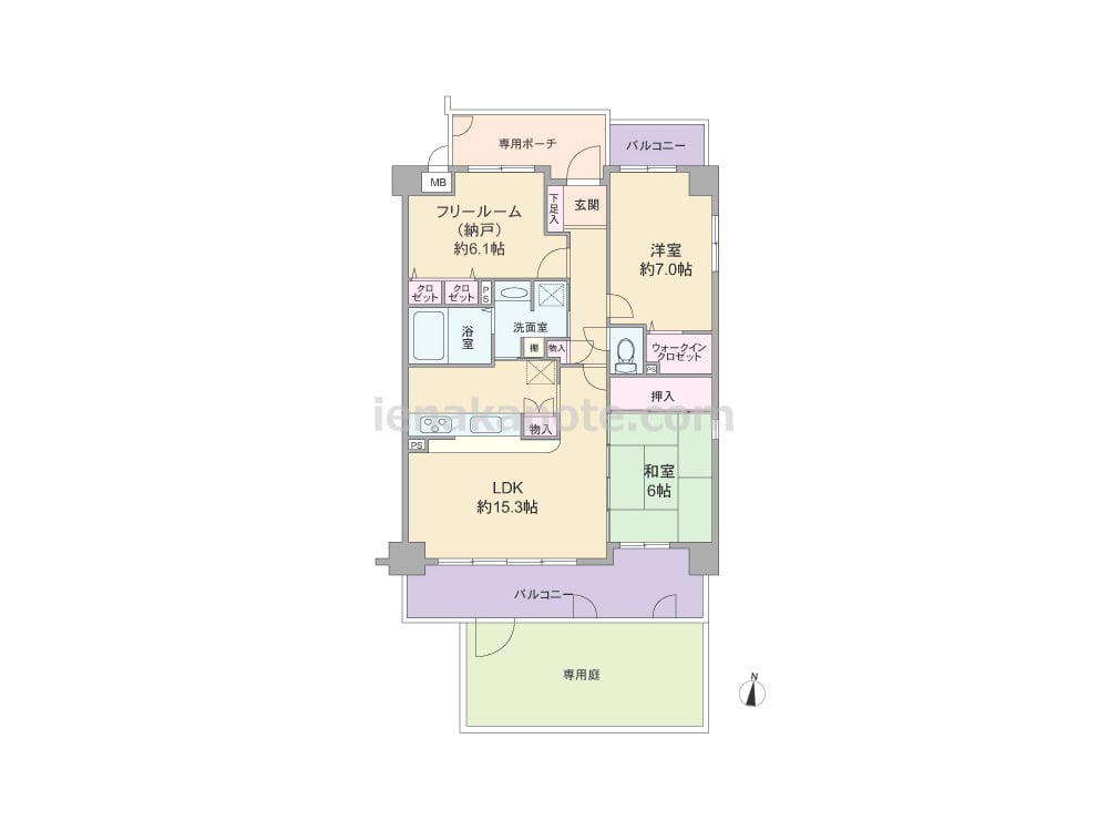 専有面積76.42平米の3LDK。専用ポーチ、専用庭が付いた戸建感覚のプラン。どの部屋も6帖以上のゆとりがあります。LDK約15.3帖に隣接する和室の引き戸を開放すれば、空間をより広々と使う事が出来ます。対面カウンタータイプのキッチンは洗面室へ行き来が可能な2WAY動線。収納が各所にもうけられています。専用庭は約19.59平米あり、ガーデニングや家庭菜園を楽しんだり、子供の遊び場にぴったりです。