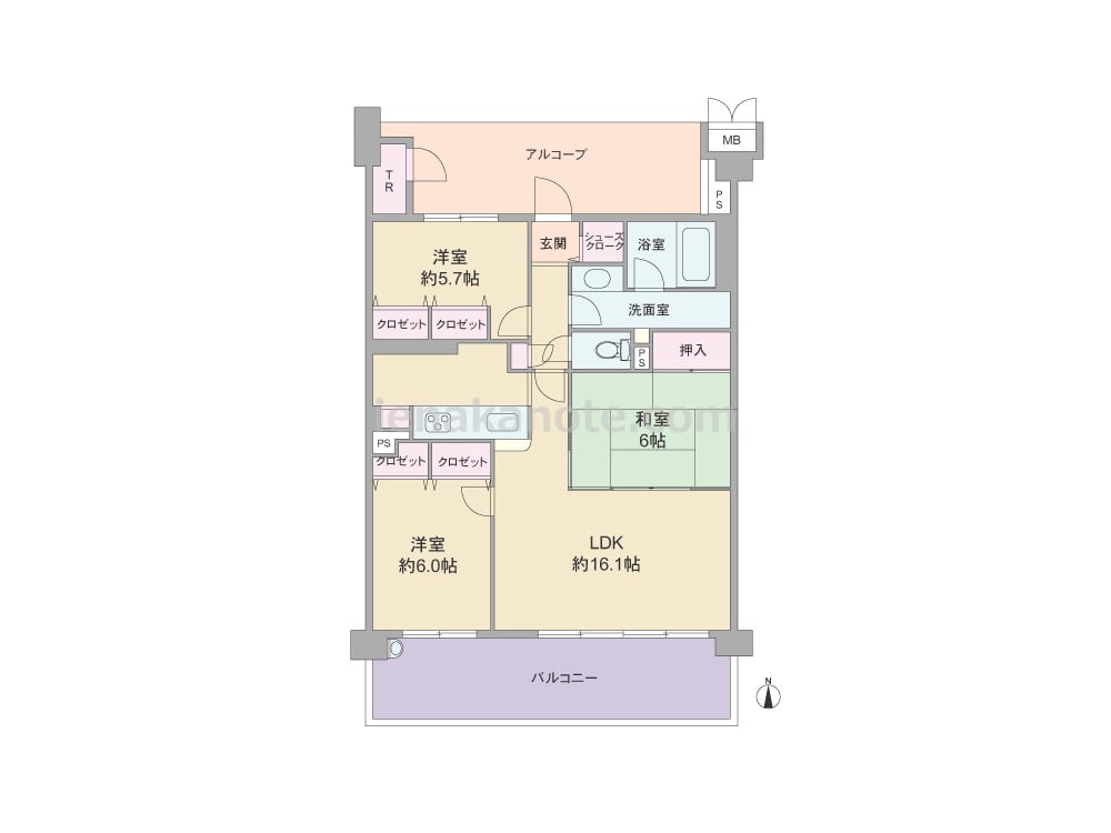 専有面積77.74平米の3LDK。共用廊下と玄関、居室の間にはプライバシーに配慮されたアルコーブがあります。LDKは約16.1帖、和室の引き戸を開放すれば約22.1帖大の空間に。生活感の出やすいキッチンは奥まって配置されているため、リビング・ダイニングをすっきり保つ事が出来ます。洋室約6.0帖はLDKから出入りするため、子供部屋にすればコミュニケーションの機会が増え安心です。バルコニーは約15.27平米の広さとスロップシンクがあります。