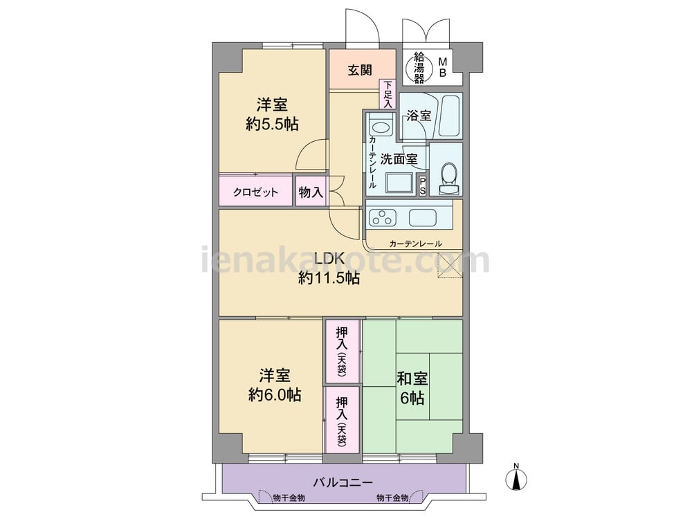 専有面積67.84平米の3LDK。LDKが部屋の中央にあるセンターリビングのプラン。キッチンにはカーテンレールが付いており、キッチンを使わない時はカーテンで目隠しできます。各居室と室内廊下に収納スペース付き。トイレは洗面室を通って出入りする造りで、トイレ・洗面室使用時の動線が重なっています。