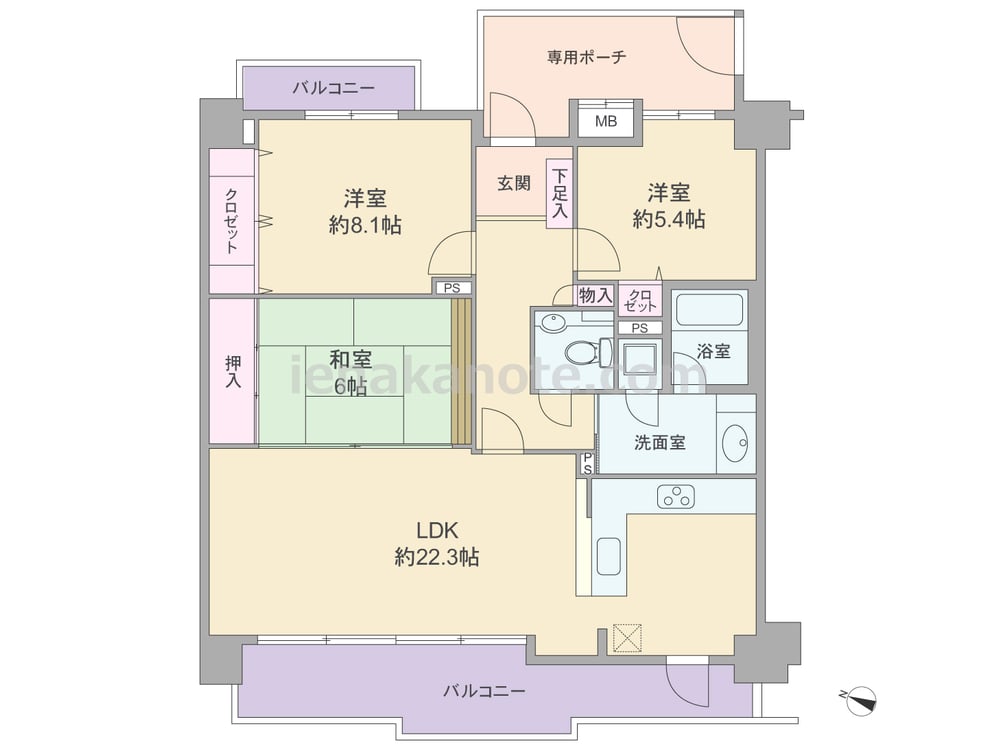 専有面積99.11平米の3LDK。玄関前に専用ポーチがある、プライバシーに配慮されたプラン。L字型の対面キッチンはバルコニーへの勝手口があります。LDKは広々約23.0帖大。和室6帖には家具を置くのに便利な板間があります。各居室と室内廊下に収納が設けられ、トイレ内に手洗いカウンター付き。洗濯機置場が奥まって配置されているため、洗面室をゆったり使う事が出来ます。バルコニーが2カ所あり、ガーデニングを楽しむのにぴったりです。