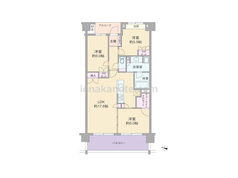 専有面積75.59平米の3LDK。玄関前にはプライバシーに配慮されたアルコーブがあります。LDKは約17.6帖あり、対面式キッチンは洗面室へ行き来が可能な家事効率のよい造り。バルコニーに面する洋室約6.0帖にはウォークインクロゼットがあり、引き戸を開放すればLDK約23.6帖にする事も可能。収納が各所に設けられています。バルコニーは約13.2平米とゆとりがあるため、ガーデニングをゆったり楽しめそうです。
