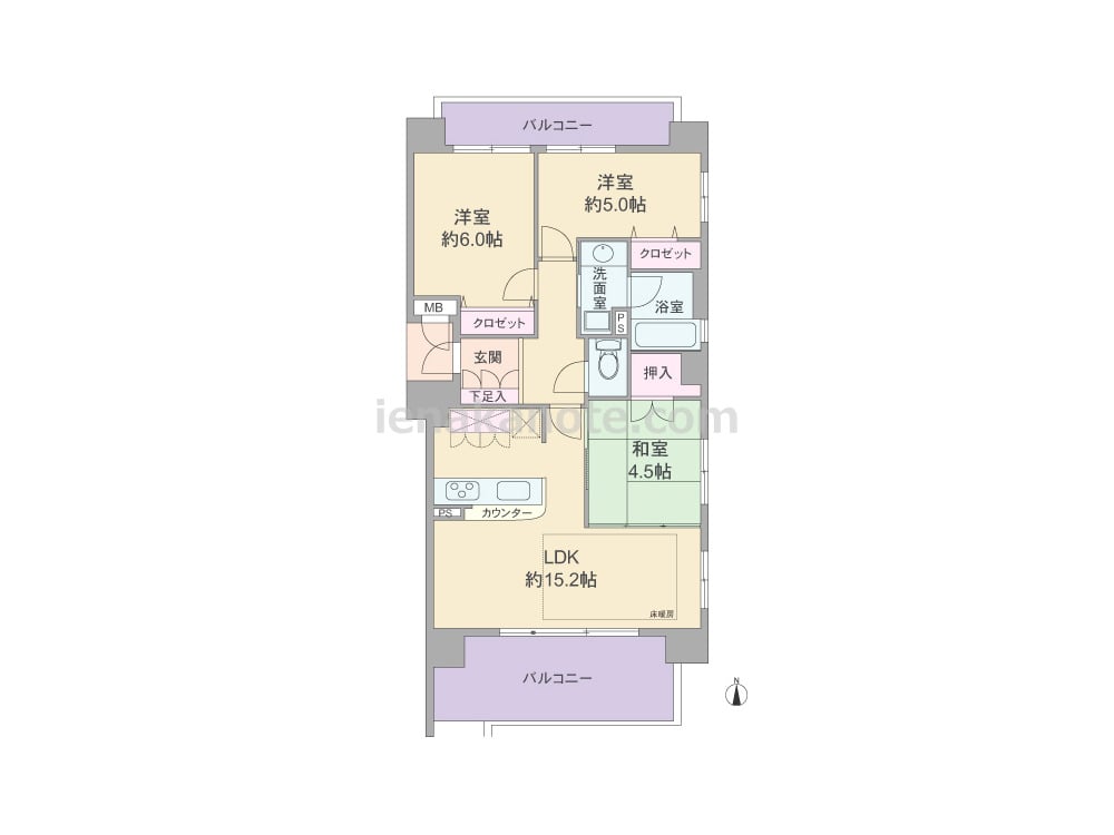 専有面積67.58平米の3LDK。南北両面にバルコニーがあるセンターインのプラン。LDK約15.2帖には和室4.5帖があり、引き戸を開放すれば約19.7帖大の空間に利用出来ます。キッチンは作業をしながら家族の顔が見える対面カウンタータイプ。各居室に収納が確保され、浴室の窓は湿気がこもりにくく快適です。