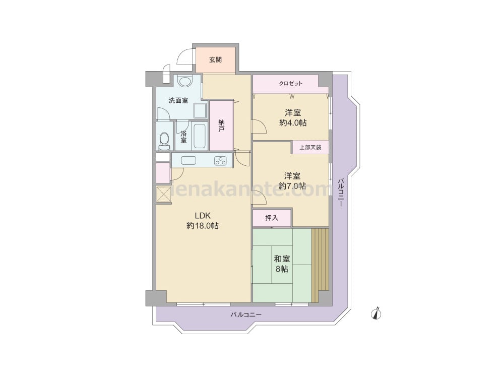専有面積90.61平米の3LDK。全部屋バルコニーに面する風通しのよいプラン。玄関先から室内を見通せないのもポイントです。LDKは約18.0帖、キッチンはI型のウォールタイプ。和室8帖には家具を置くのに便利な板間があります。トイレは洗面室を通って出入りする造り。廊下に面して収納力のある納戸付き。L字型のバルコニーは約18.52平米の広さがあります。