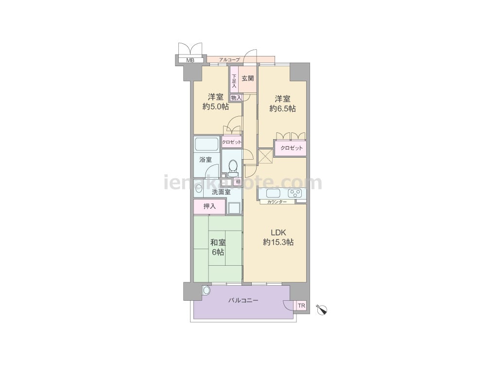 専有面積71.2平米の3LDK。LDKは約15.3帖、和室の引き戸を開放すれば約21.3帖大の空間に。対面カウンタータイプのキッチンは洗面室との距離が近い、家事動線のよい造り。各居室と玄関ホールに収納があり、バルコニーにはトランクルームとスロップシンクが付いています。