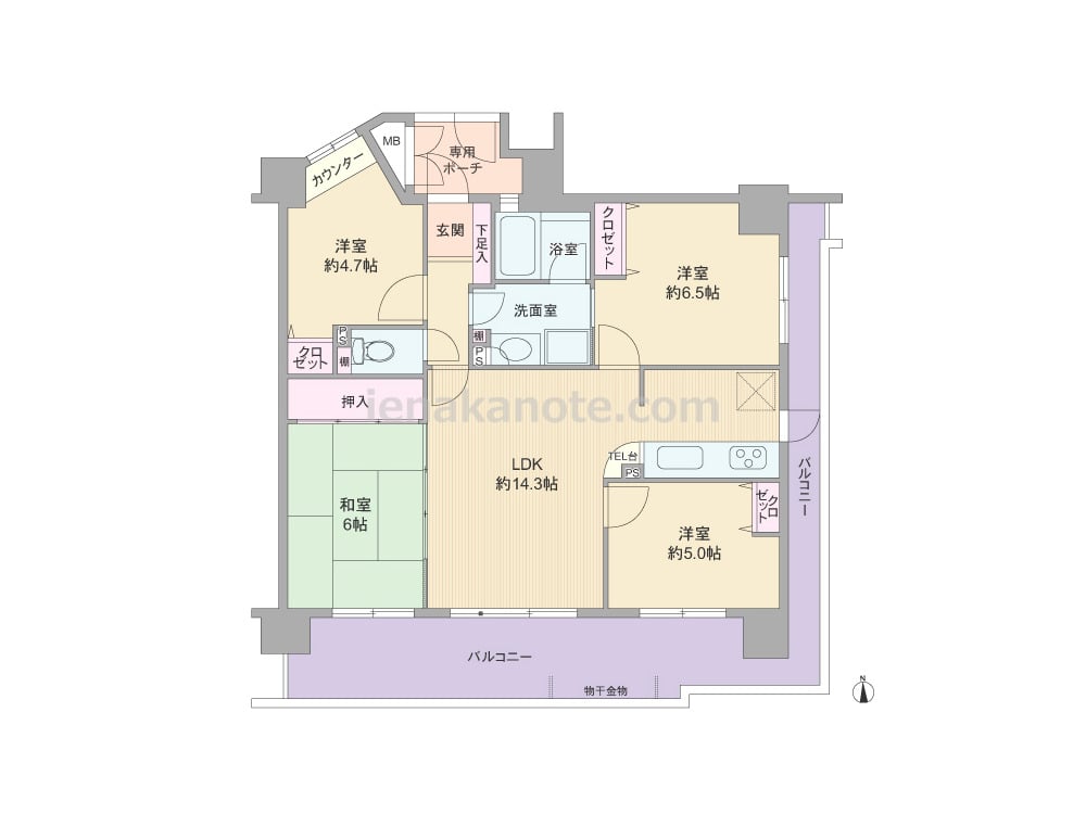 専有面積75.76平米の3LDK。LDKを含む4部屋がバルコニーに面する明るく風通しのよいプラン。玄関前にはプライバシーに配慮された専用ポーチがあります。LDKは約14.3帖、生活感の出やすいキッチンは奥まって配置され、キッチン横にはバルコニーへの勝手口付き。洋室約4.7帖以外はLDKを通って行き来するため、家族のコミュニケーションの機会が増えそうです。浴室の窓は湿気がこもりにくく快適。L字型のバルコニーは約24.43平米の広さがあり、ガーデニングをたっぷり楽しめます。