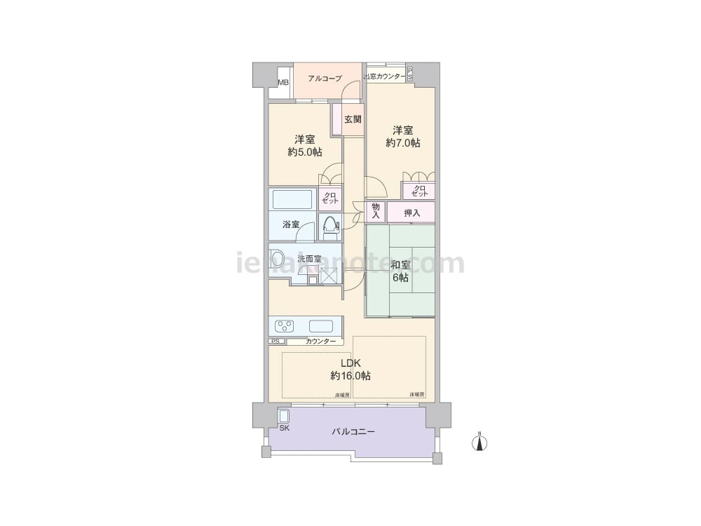 専有面積75.61平米の3LDK。玄関前にはプライバシーに配慮されたアルコーブがあります。LDKは約16.0帖、対面カウンタータイプのキッチンは洗面室へアクセス可能な2WAY動線。和室6帖は室内廊下とLDKの2カ所から出入りでき、くつろぎのリビングスペースや来客時の客間など色々な使い方が出来ます。各居室と室内廊下、洗面室に収納スペース付き。バルコニー約13.4平米にはスロップシンクも付いています。