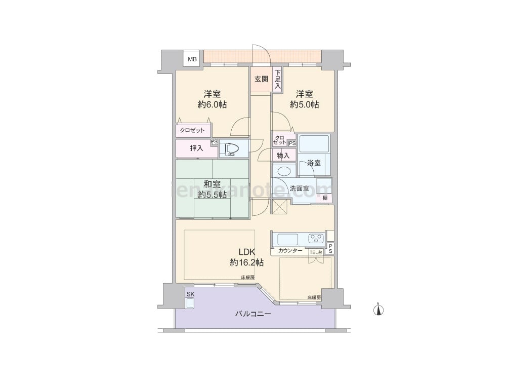 専有面積73.08平米の3LDK。LDKは約16.2帖、隣接する和室の引き戸を開放すれば約21.7帖大の空間に。対面カウンタータイプのキッチンは洗面室へ行き来が可能な家事動線の良い造りです。各居室と室内廊下に収納スペース付き。バルコニー約11.91平米には洗い物やガーデニングでの利用に便利なスロップシンクがあります。
